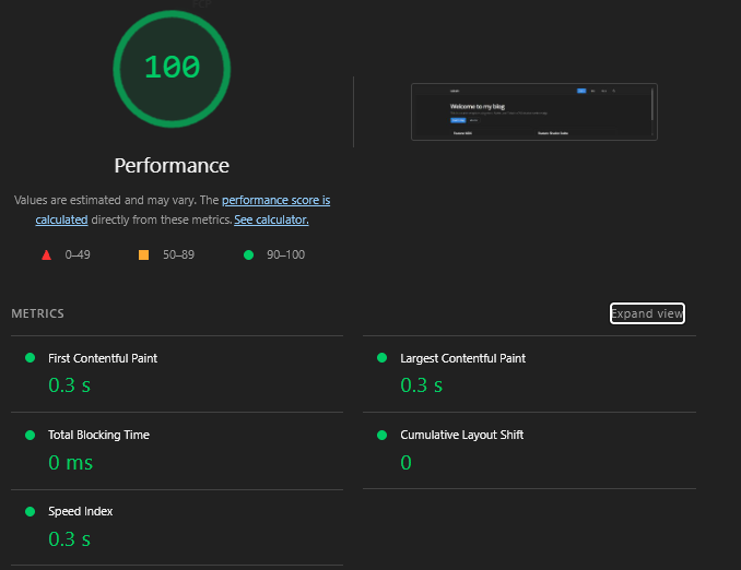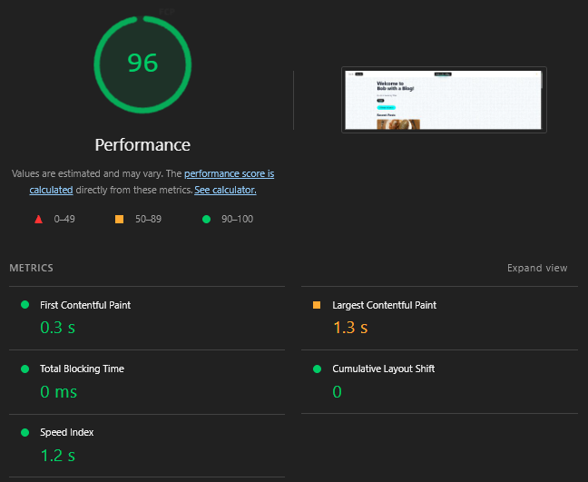 Here is the performance audit results from Google Chrome’s Lighthouse audit on the Bob with a Blog website: